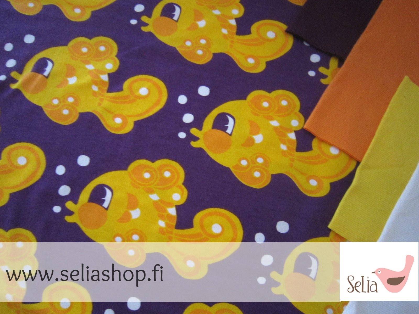 Jersey Singing Fish in lila/gelb von Selia. Waschbar bei 30-40 Grad (bitte "von links" waschen), Stoffeinlauf beim Waschen/Bügeln ca. 3% Bügelbar Stufe 1 Breite: ca. 165 cm Material: 95% Baumwolle 5% Lycra
