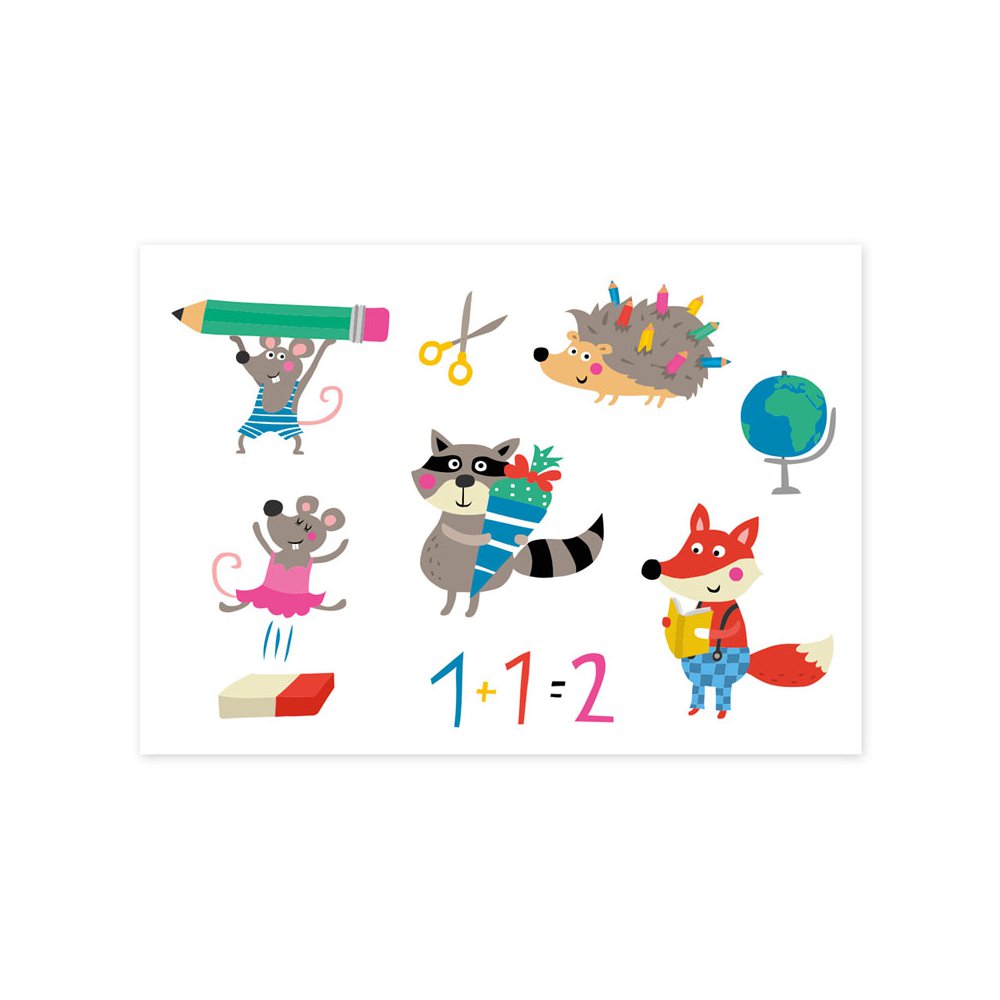 Mit dem vom Nastja Holtfreter gestalteten Tattoobogen "Schule 1+1=2" kommt farbenfroher Spaß auf die Haut.