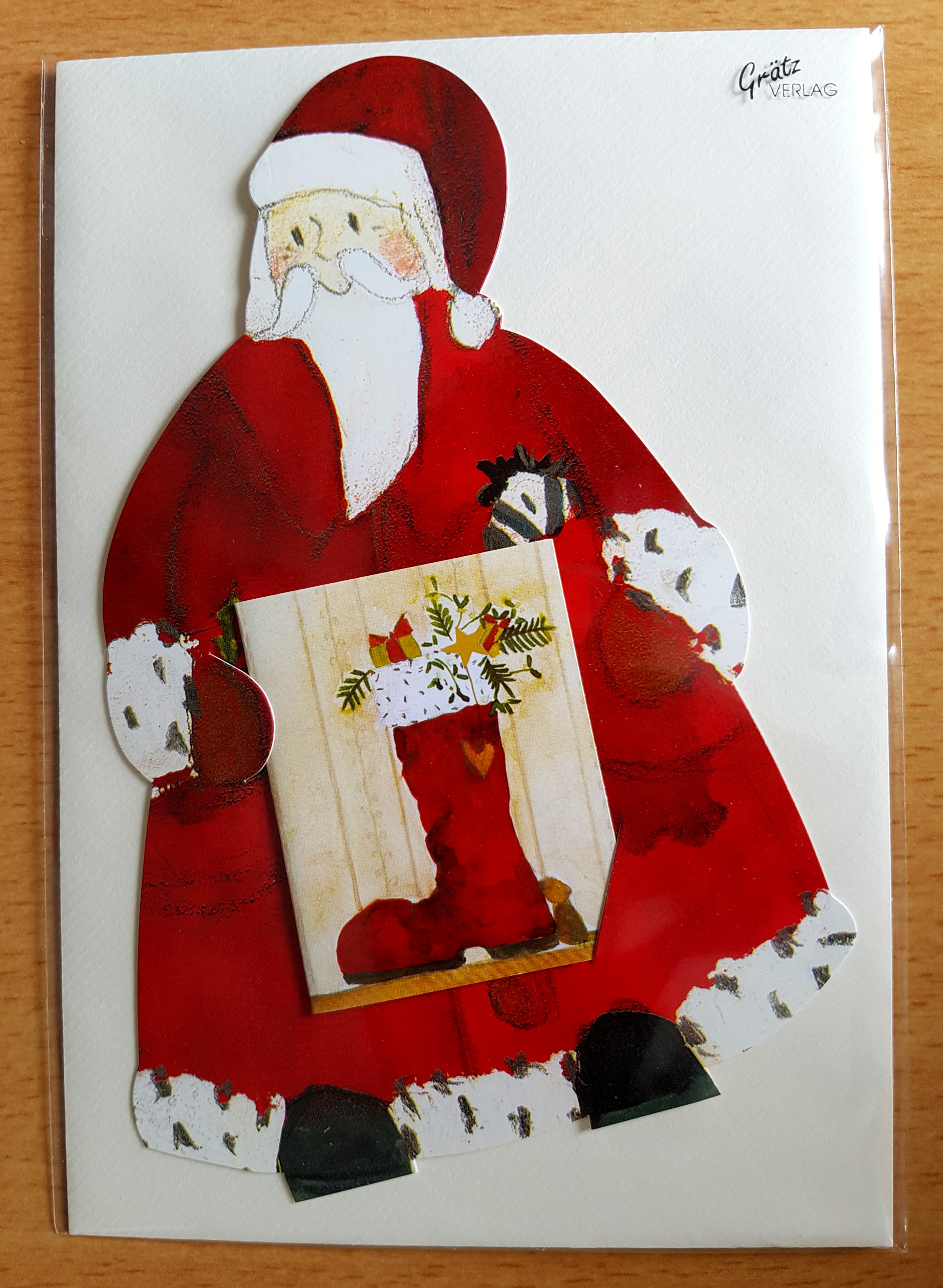 Schöne Weihnachtskarte in Form eines Weihnachtsmannes, der ein Kärtchen für persönliche Botschaften in den Händen hält. Mit Umschlag, in Klarsichthülle mit Klebeverschluss.