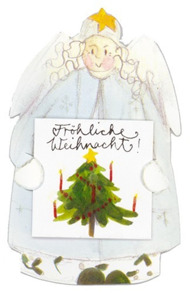 Diese Geschenkaufklebefigur hält ein Miniatur-Klappkärtchen in den Händen, in dem persönliche Grüße und Glückwünsche ihren Platz finden können.